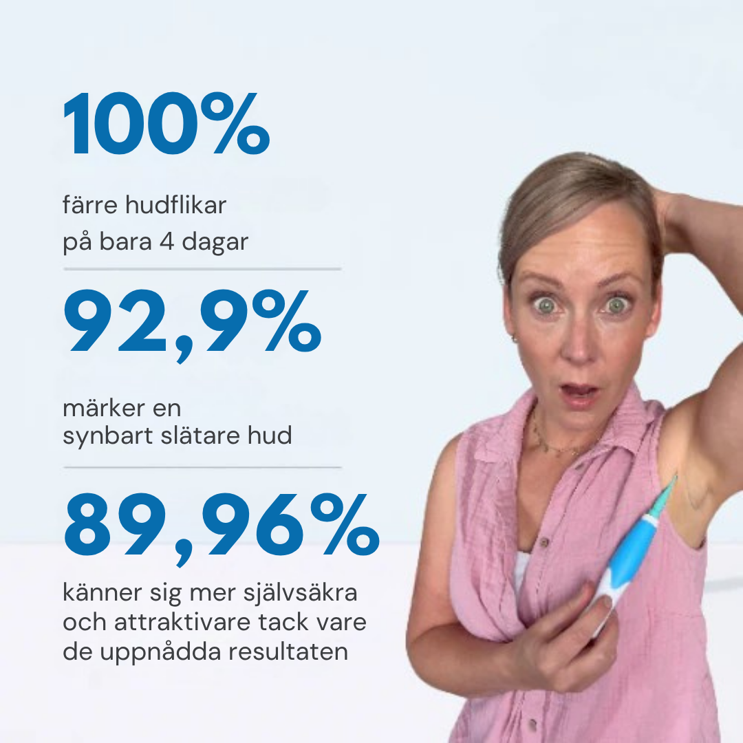 Vårt medicinskt inspirerade system tar bort hudflikar skonsamt, säkert och utan ärr – direkt hemma hos dig.